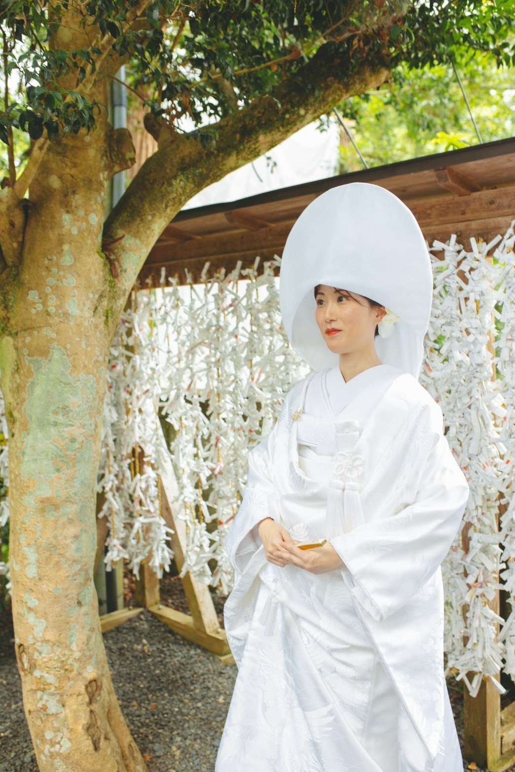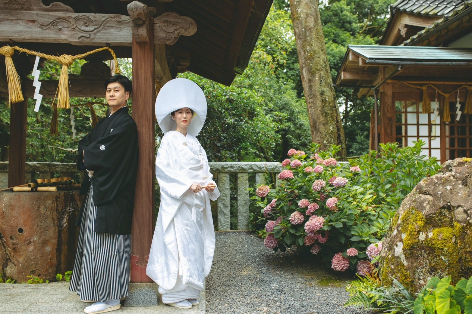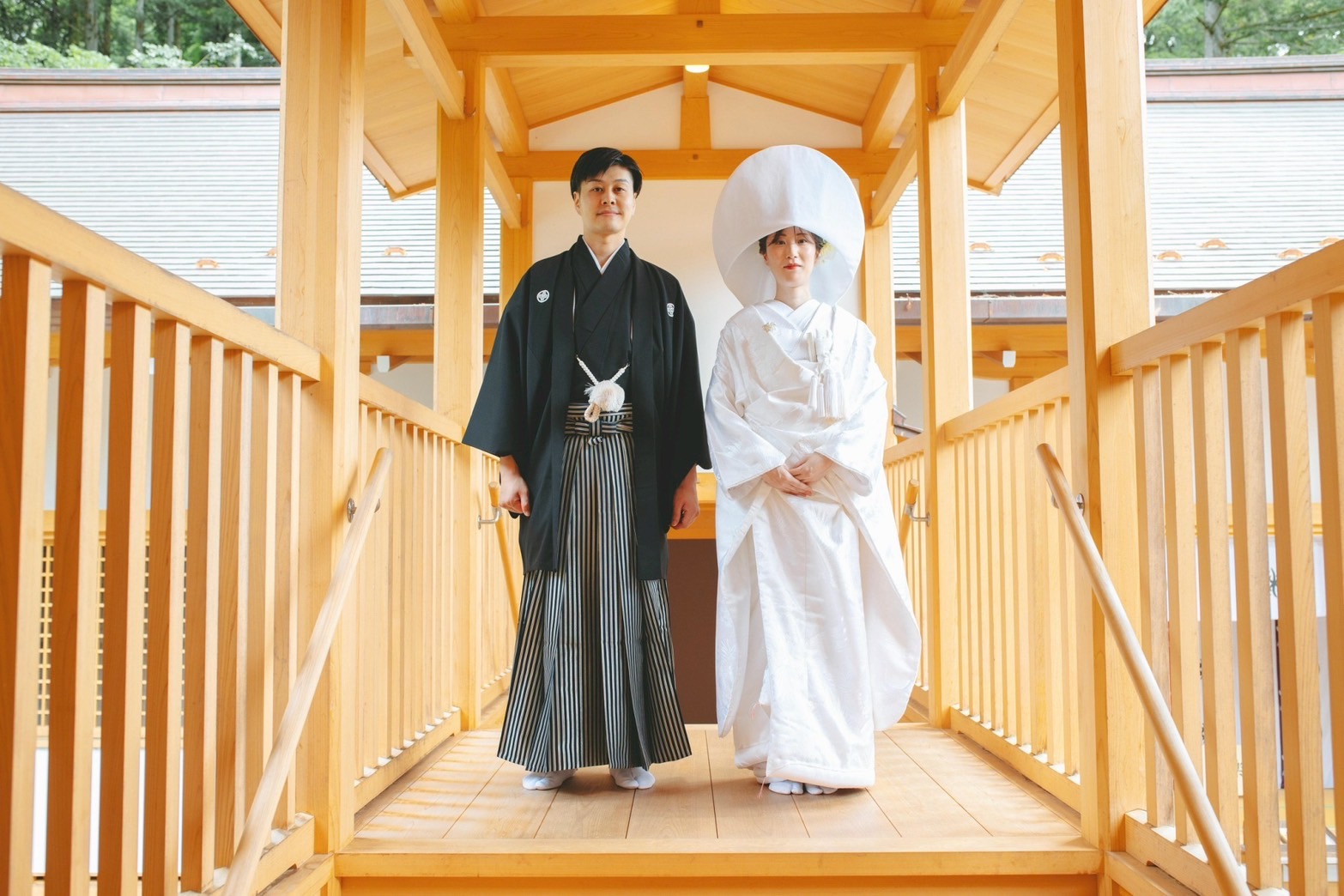 春の訪れとともに、桜が舞う神社で伝統的な神前式を挙げませんか?厳かで神聖な雰囲気の中、和装姿が美しく映える舞台をご用意しています。